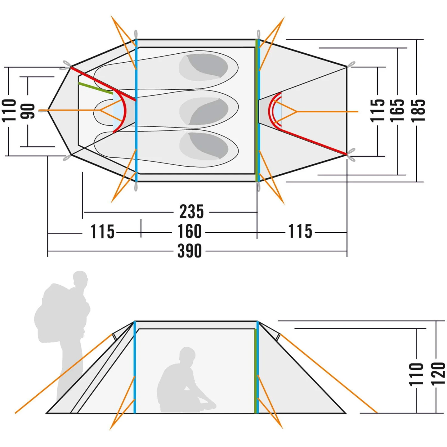 Merkmale: Tunnelzelt mit zwei Gestängebögen; Apside mit Fronteingang; Zwei Eingänge in das Außenzelt; Zwei Lüfter im Außenzelt; Wasserdicht versiegelte Nähte; Wasserdichte Verarbeitung der Abdeckungen, Lüfter und Ansatzpunkte; Reflektierende Zeltleinen; Praktische Packhilfe für Zeltleinen; Verstärkte Eckpunkte mit Gurtbandschlaufen; Extra langes Innenzelt (235 cm) für mehr Liegekomfort; Zwei Eingänge in das Innenzelt, einer davon mit separat verschließbarem Moskitofenster; Zwei Einstecktaschen im Innenzelt neben dem Eingang; Bequeme Einstecktasche in Greifhöhe am Fußende; Wäscheleine im Innenzelt; Eloxiertes Aluminium-Zeltgestänge; Inklusive Packsäcke für Zelt und Gestänge