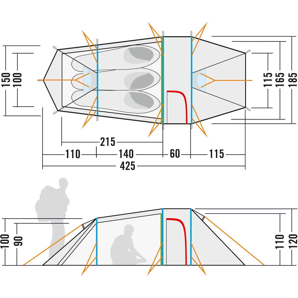 Merkmale: Tunnelzelt mit drei Gestängebögen; Verkürztes hinteres Zeltgestänge; Apside mit Seiteneingang; Zwei Lüfter im Außenzelt; Wasserdicht versiegelte Nähte; Wasserdichte Verarbeitung der Abdeckungen, Lüfter und Ansatzpunkte; Reflektoren an den Zeltleinen; Praktische Packhilfe für Zeltleinen; Verstärkte Eckpunkte mit Gurtbandschlaufen; Eingang in das Innenzelt mit separat verschließbarem Moskitofenster; Zwei Einstecktaschen im Innenzelt neben dem Eingang; Bequeme Einstecktasche in Greifhöhe am Fußende; Wäscheleine im Innenzelt; Lüfter im Innenzelt; Eloxiertes Aluminium-Zeltgestänge; Inklusive Packsäcke für Zelt und Gestänge