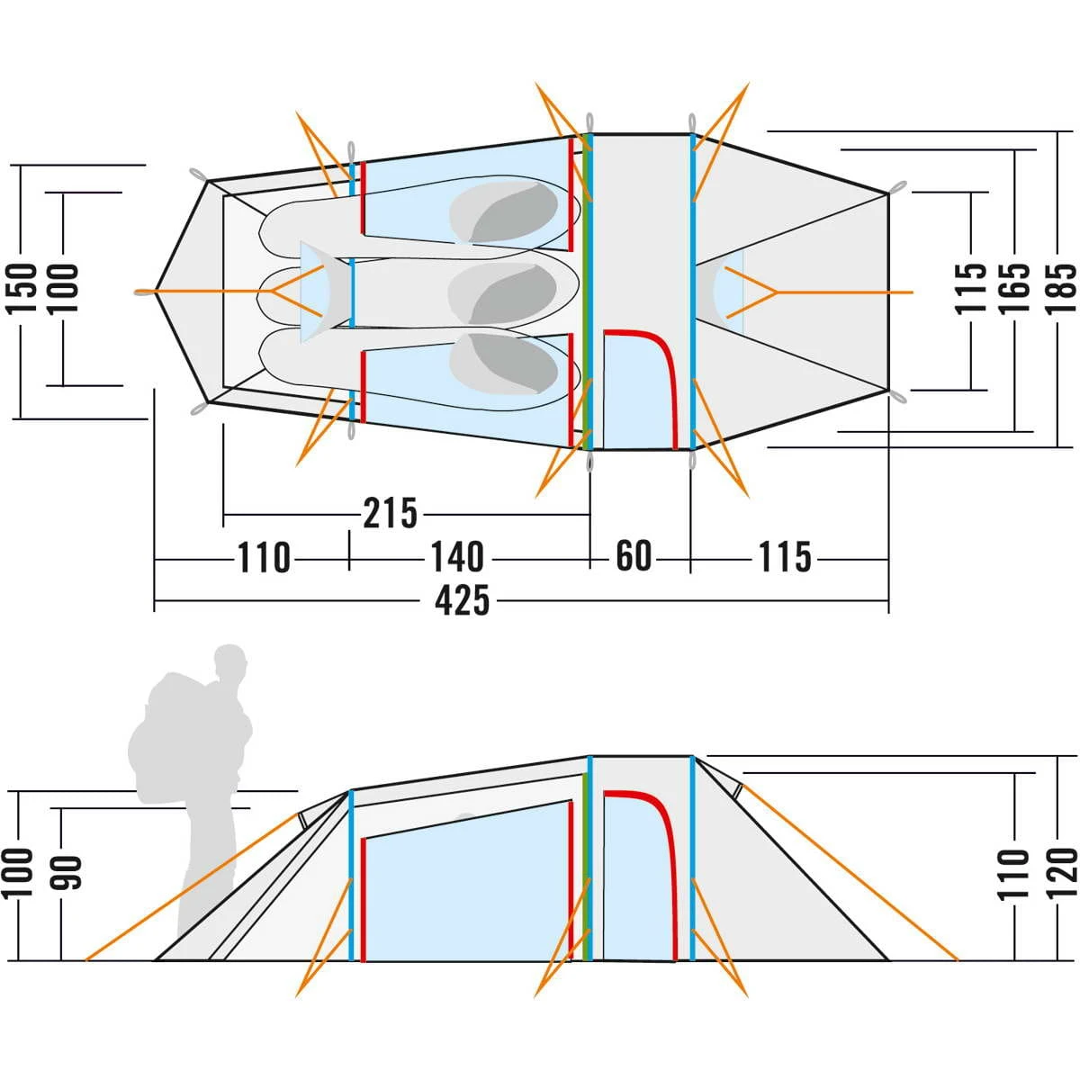 Tunnelzelt mit drei Gestängebögen; Apside mit Seiteneingang; Seitenwände des Außenzeltes zum Hochrollen; Zwei Lüfter im Außenzelt; Wasserdicht versiegelte Nähte; Wasserdichte Verarbeitung der Abdeckungen, Lüfter und Ansatzpunkte; Reflektoren an den Zeltleinen; Praktische Packhilfe für Zeltleinen; Verstärkte Eckpunkte mit Gurtbandschlaufen; Innenzelt komplett aus Moskitonetz; Zwei Einstecktaschen im Innenzelt neben dem Eingang; Bequeme Einstecktasche in Greifhöhe am Fußende; Wäscheleine im Innenzelt; Eloxiertes Aluminium-Zeltgestänge; Inklusive Packsäcke für Zelt und Gestänge