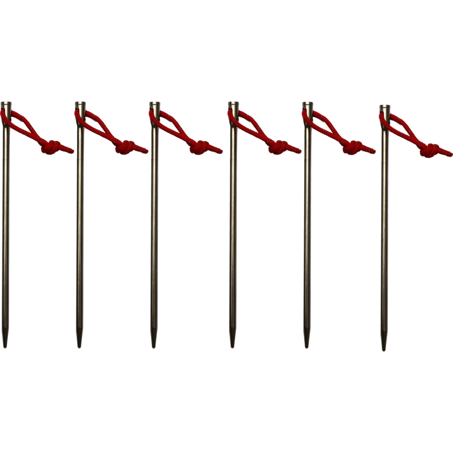 Der Vargo Titanium Nail Peg ist außergewöhnlich stark und bietet exzellente Haltekraft. Sein flacher Kopf und sein gerader Schaft biegen sich nicht, wenn er selbst in den härtesten Boden geschlagen wird. Die reflektierende Schnur bietet erhöhte Sichtbarkeit und einfacheres Entfernen.